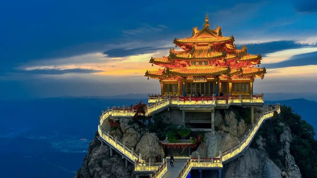 >午后直奔>洛阳老君山>,乘中灵索道+峰林索道直抵金顶道观群。强烈建议留宿山顶!