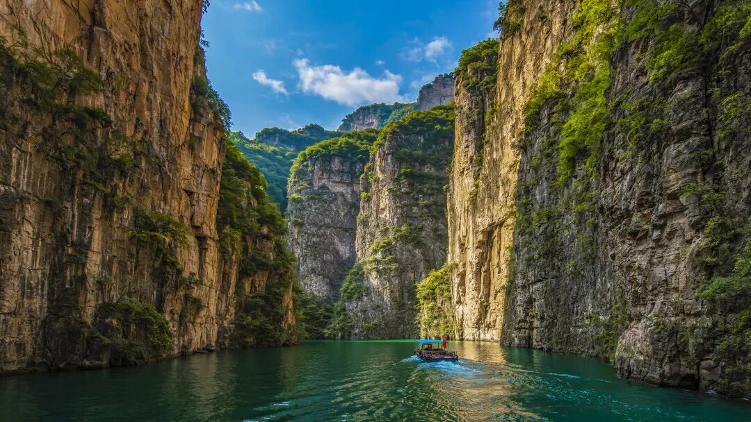 >驱车40分钟抵青天河,乘船解锁“>北方小三峡>”秋日限定版!船头劈开翡翠色水面,两岸黄栌、槭树、山楂树倒映成莫奈油画。