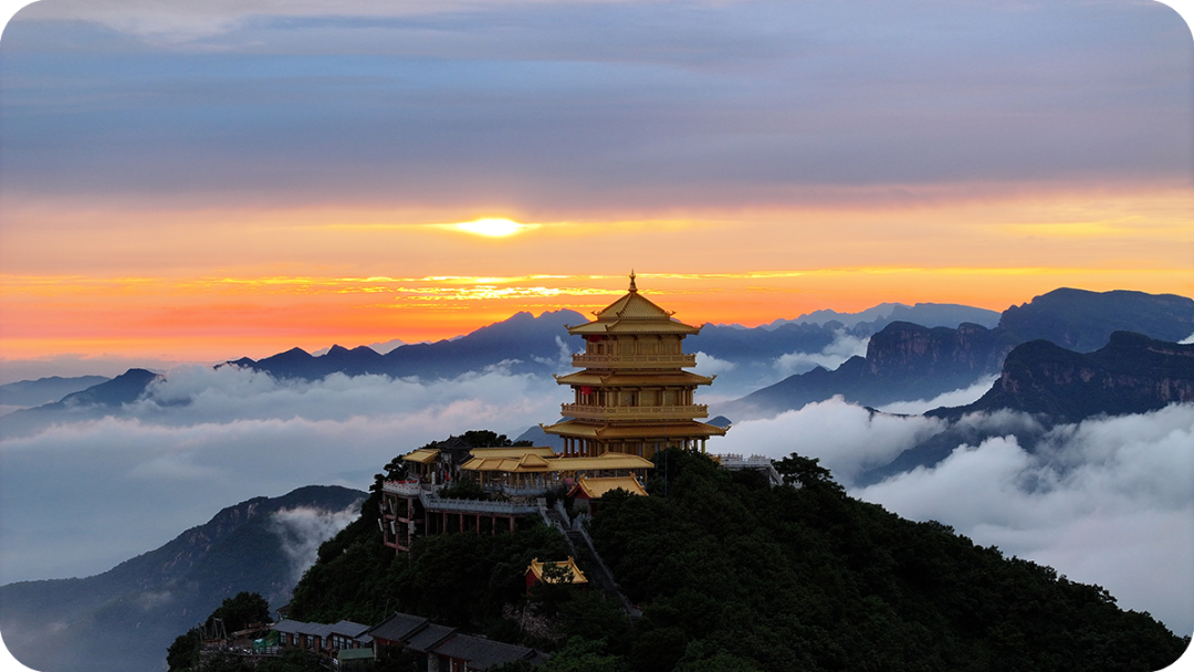 >次日黎明推门即见惊世画面:>日出点燃十里画屏>,金殿在翻腾云海中若隐若现......下山记得用>栾川豆腐宴>抚慰灵魂~